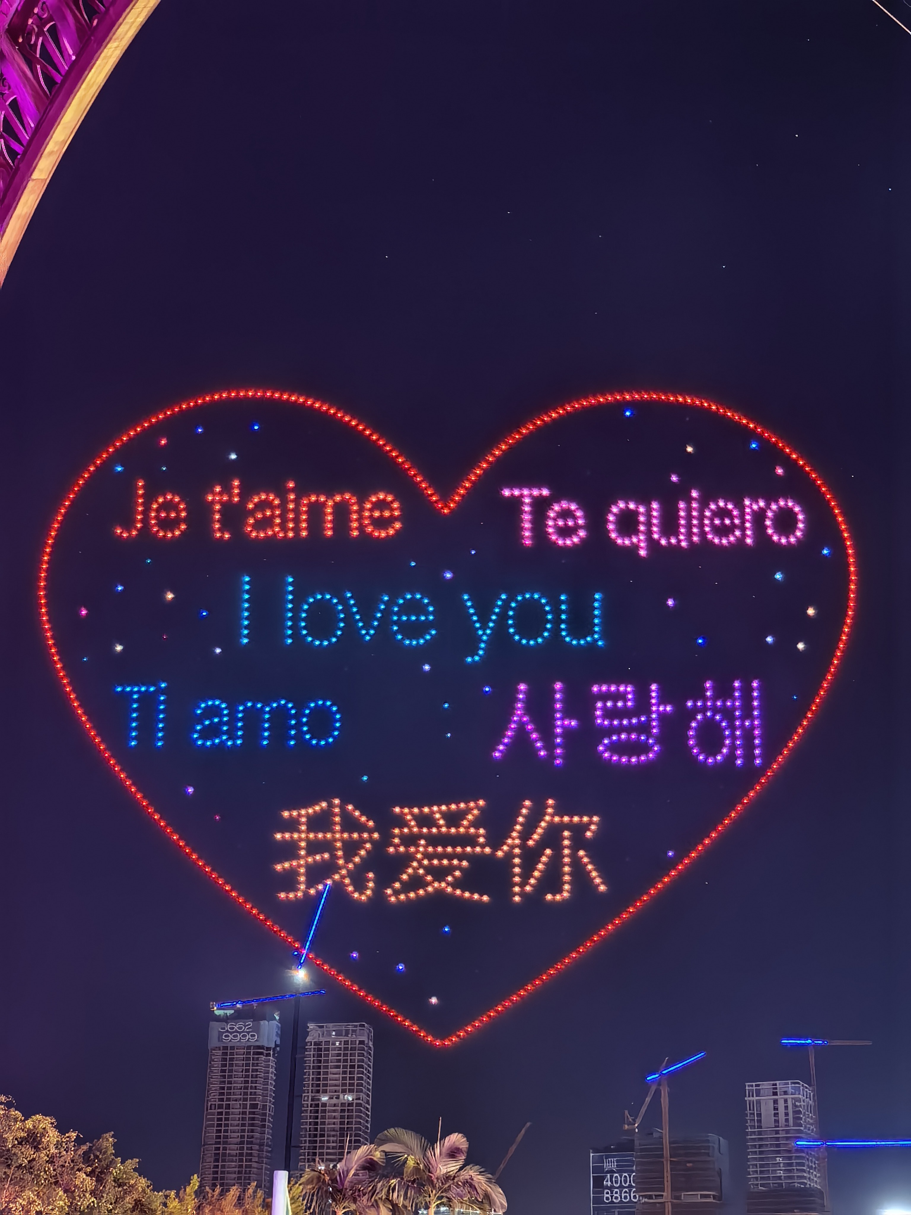 本次活动亮点纷呈,“音乐节+颁证”的沉浸式体验吸引了优秀乐队、歌手倾情加盟,打造涵盖古风、流行、摇滚、治愈等多元曲风的爱情音乐盛宴,营造浪漫温馨的现场氛围,用不同旋律诠释美好爱情的模样。暮色降临,世界之窗标志性埃菲尔铁塔为爱变粉,与暮色交融尽显浪漫;千架无人机腾空而起,在空中变换出爱心、情书、玫瑰等温馨造型,以科技之光传递祝福。