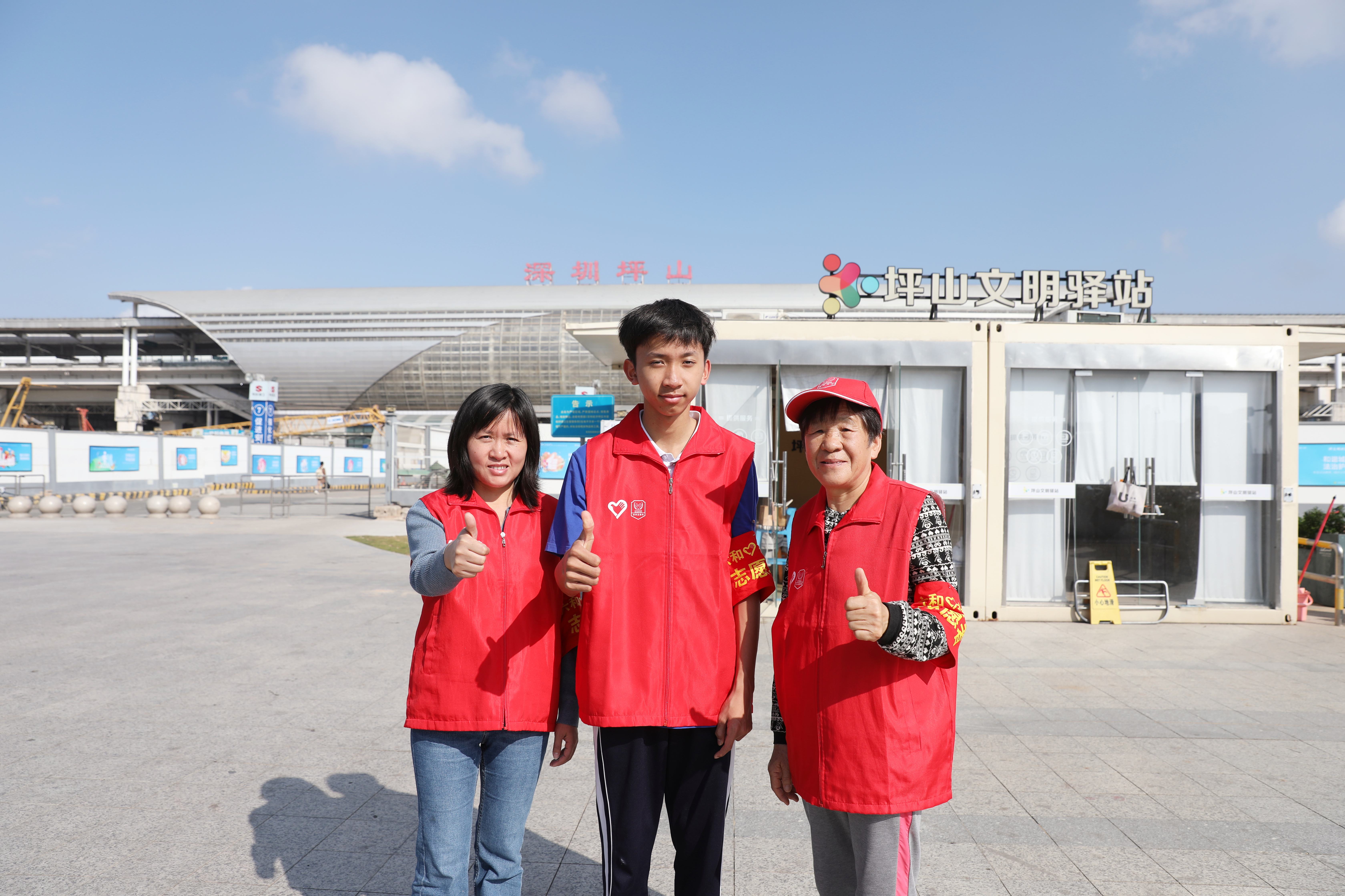 坪山街道六和社区志愿者在坪山高铁站,用热情服务温暖旅客回家路。