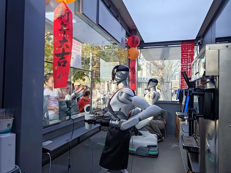 ▲2026年2月13日,广东深圳,智魔方咖啡小站内两台智能机器人在顾客扫码点餐后,自主制作饮品6款口味咖啡饮料。图源:CFP