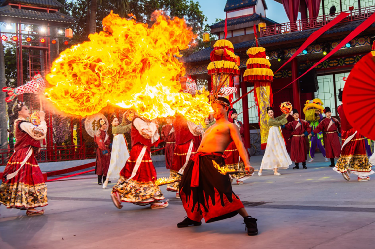 白天的民俗村内更是精彩纷呈,《金银鸟》《舞脉相承》《扎西德勒秀》等七大全新精品演艺,以及《上刀山》《纳兹库姆》《木鼓欢歌》等特色非遗民俗演艺全天候轮番上演,不同时段、不同村寨皆有精彩演艺,让游客漫步锦绣中华的每一处,都能感受最纯正、最浓郁的民俗年味。