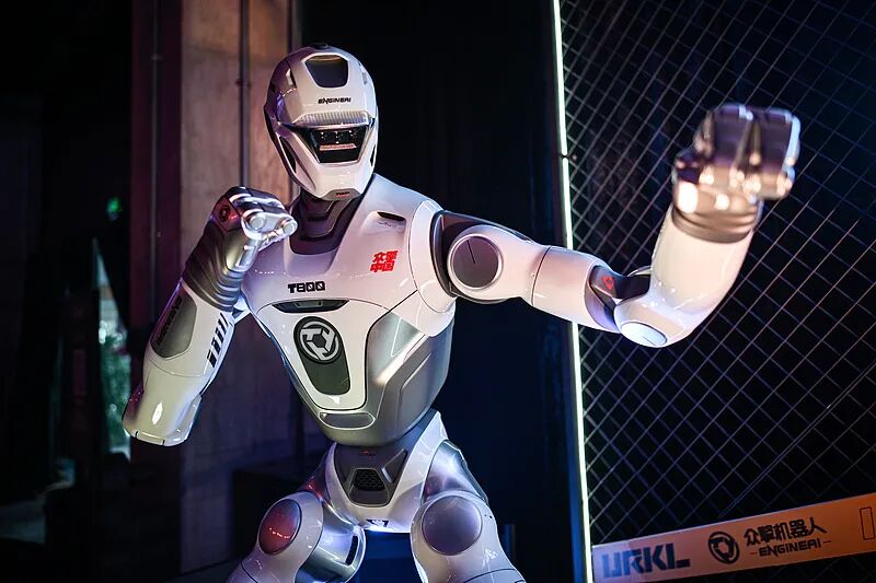 ▲2026年2月14日,广东深圳,众擎人形机器人在全球人形机器人自由格斗联赛(URKL)线下启动活动上展出。由众擎发起的全球人形机器人自由格斗联赛(URKL)将逐步开启。图源:CFP