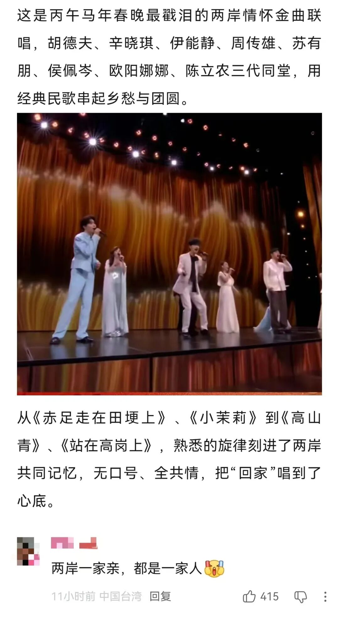“欧阳娜娜、侯佩岑来了,8位台湾歌手在春晚齐唱两岸一家亲”“春晚短片到台湾新北取景了,是在哪片海滩拍的?”“张钧甯首次登上春晚舞台”“言承旭歌曲科技感十足”……
