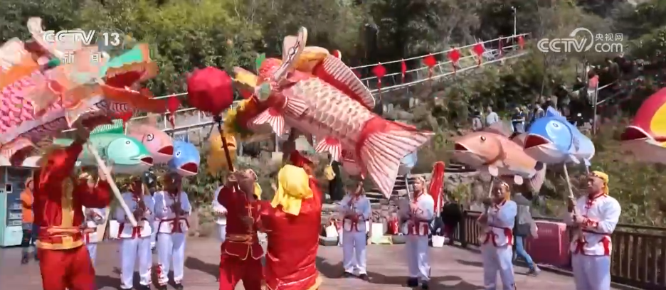 记者身后的九鲤湖景区,湖光山色、层峦叠翠,展现出南方山岳特有的灵秀。景区里最热门的打卡点之一,叫作“一线天”。这里最窄处不到30厘米,一次只能容一人贴壁通过,游客需要侧身慢慢穿行,在狭窄石缝间体验攀登的乐趣。记者身旁正在巡游的就是当地的非遗——店下鱼灯。大家看,一盏盏彩绘鱼灯随着队伍前进上下摆动,像鱼儿在水里游,特别灵动。在过去,渔民会用鱼灯祈愿出海平安、丰衣足食。过年的时候看鱼灯,也寓意“年年有余、风调雨顺”。