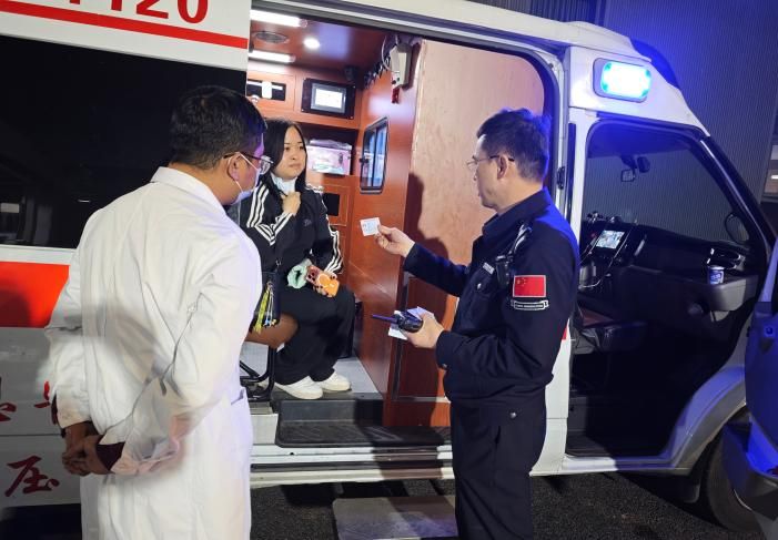 与此同时,负责现场协调的巡查监护队民警也已就位,无缝对接,引带救护车一路快速通行至皇岗—落马洲桥头的深港分界线。在那里,深港双方的救援力量顺利完成了生命接力的“关键一棒”。整个通关、引导、交接过程紧密衔接、流畅高效,为患者返港救治赢得了宝贵时间。