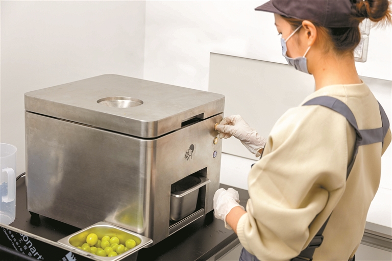 店员使用自动去皮机制备青提鲜果。受访单位供图