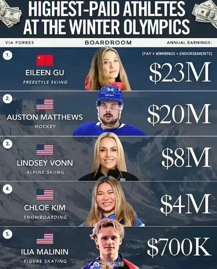 ● 福布斯发布本届冬奥会运动员收入榜,谷爱凌以2300万美元居首。