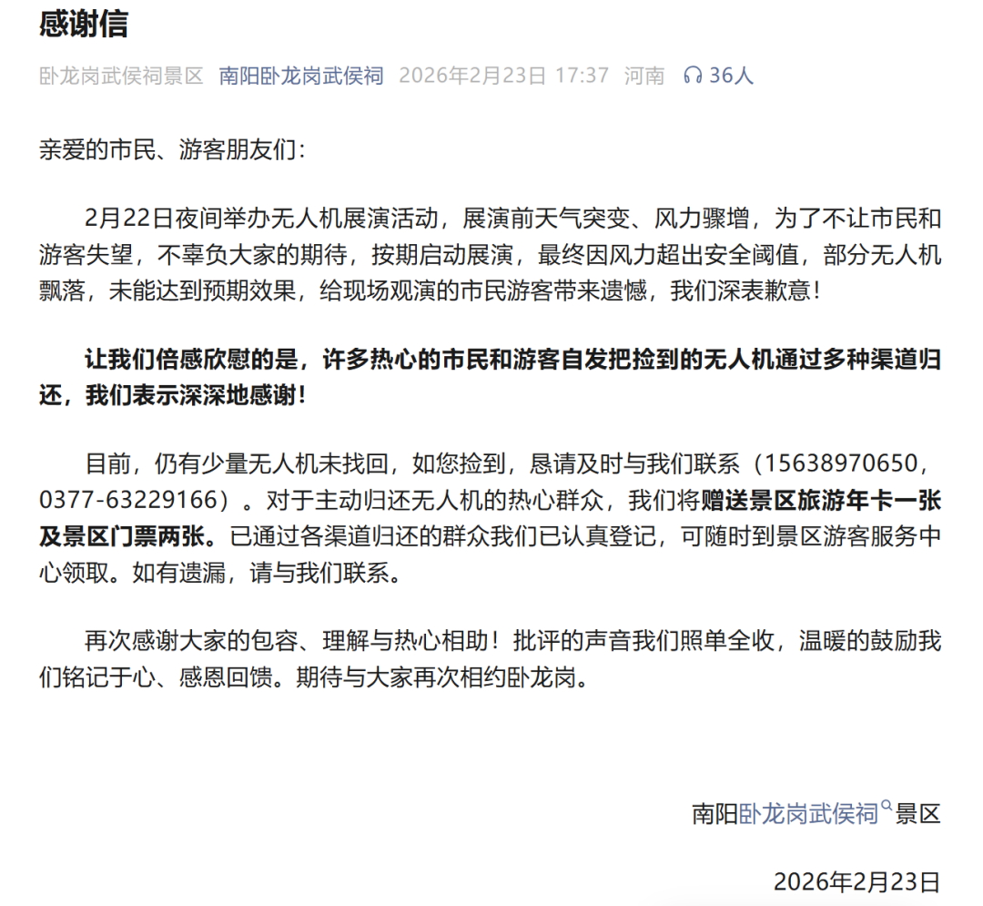 ● 河南一景区2026架无人机表演突遇大风部分被吹落,多位市民呼吁捡到及时归还,景区发感谢信:主动归还将送旅游年卡1张及门票2张。