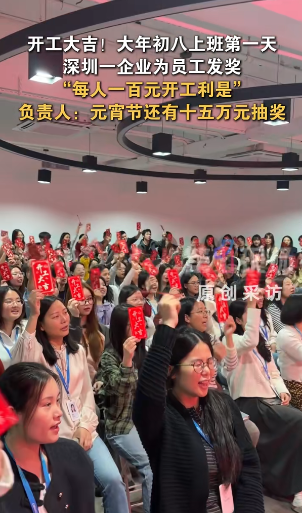 ●开工首日,深圳一企业为员工发奖,“每人一百元开工利是”,负责人:元宵节还有十五万元抽奖。