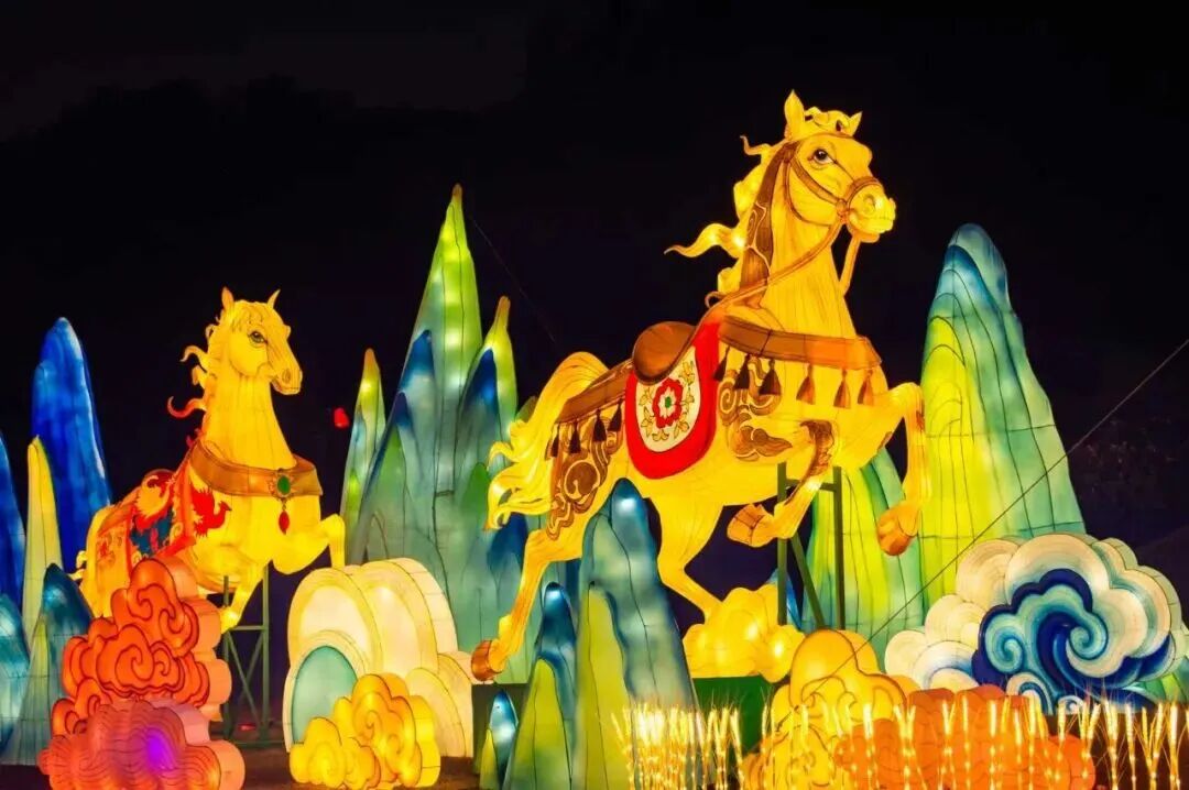 40余组巨型灯组点缀成璀璨的灯海中最引人注目的,莫过于园区中心高达8米的“骏马奔腾”主灯。这匹“骏马”身姿矫健,流光溢彩,成为无数游客驻足拍照的焦点。