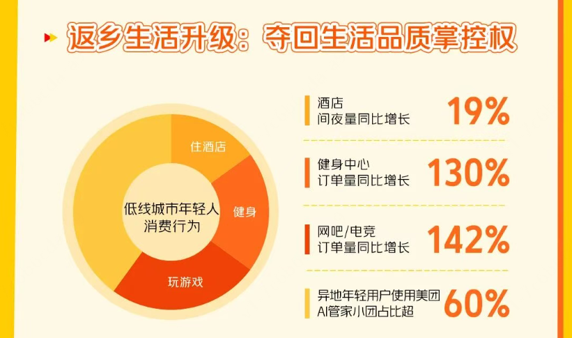 “回家不住家里住酒店”成了县城过年的新风尚。美团数据显示,低线城市酒店订单量同比增长19%,健身中心订单量更是暴涨130%。美容美发、按摩足疗等店铺也因为返乡年轻人的到来,迎来了一年中最忙碌的时刻。