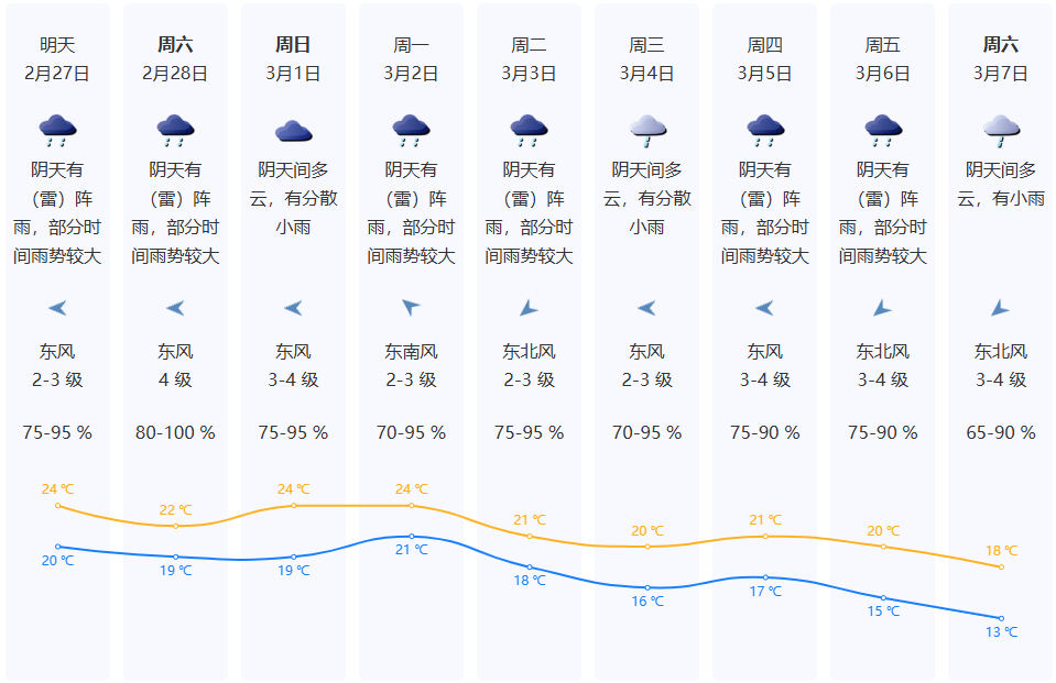 2月27-28日阴天有(雷)阵雨,部分时间雨势较大,局地累计雨量可达暴雨,可能伴有初雷;