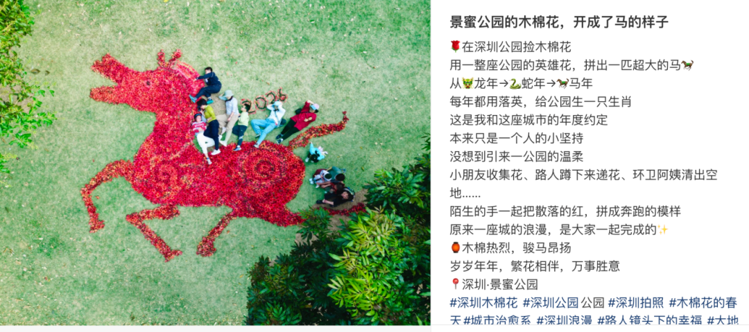 ●福田:福田景蜜公园的木棉花盛开,网友用捡来的木棉花拼成了骏马奔腾图。