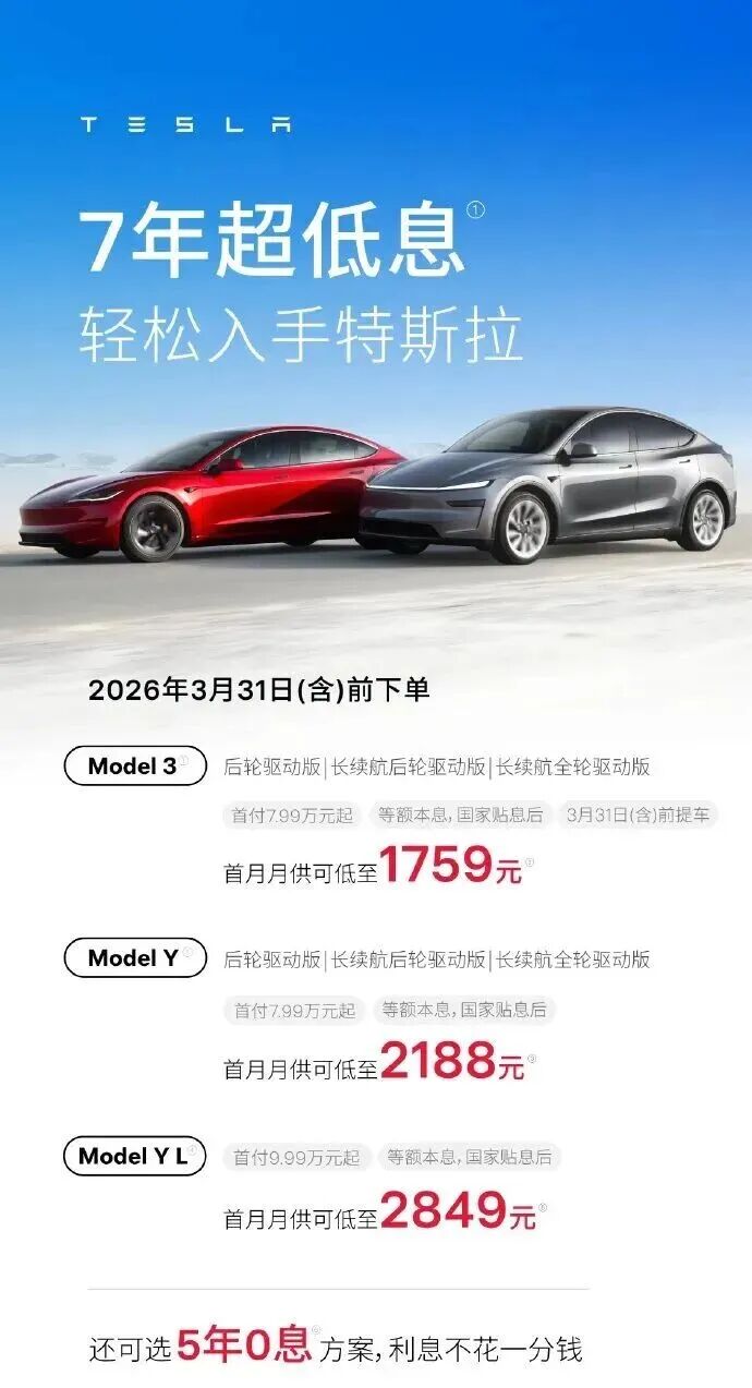 ● 2月26日,特斯拉中国宣布,3月31日(含)前下单,可享受7年超低息贷款购车政策。