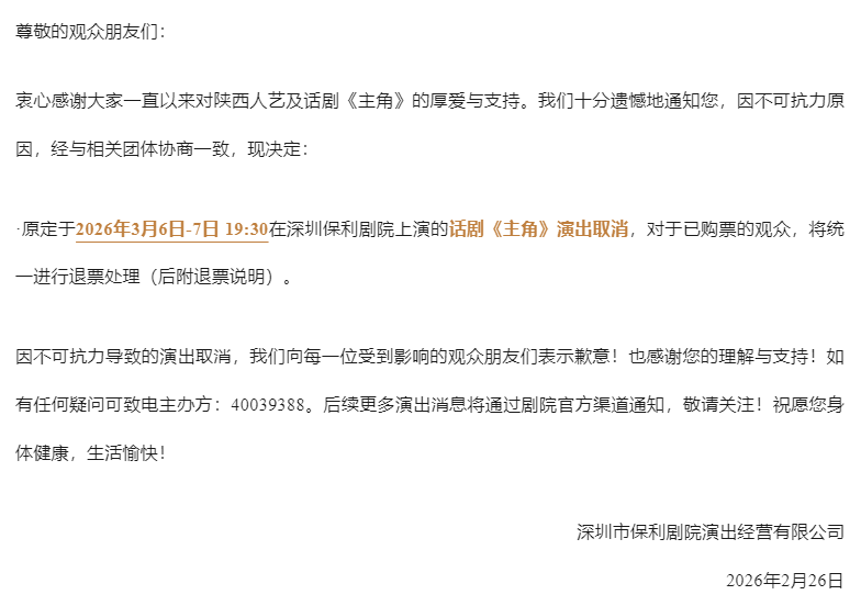 ● 南山:深圳保利剧院微信发布公告,原定于2026年3月6日-7日在深圳保利剧院上演的话剧《主角》演出取消,对于已购票的观众,将统一进行退票处理。