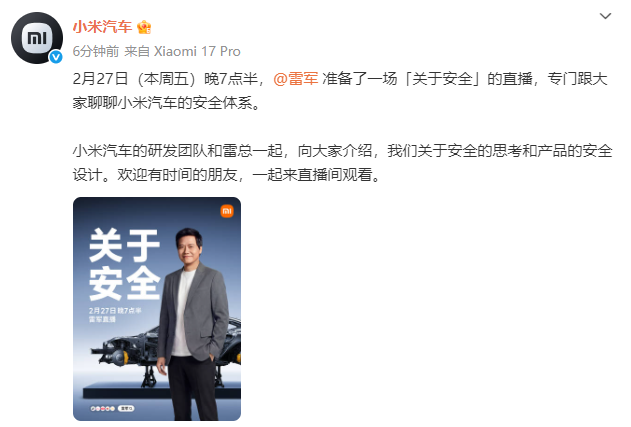 ●雷军发文称马年第一场直播定档2月27日晚7点半,“专门跟大家聊聊小米汽车的安全体系”。详情>>