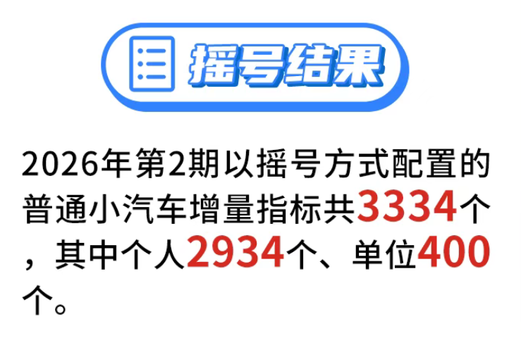● 2026年第2期粤B摇号结果公布。普通小汽车增量指标共3334个,其中个人2934个、单位400个。
