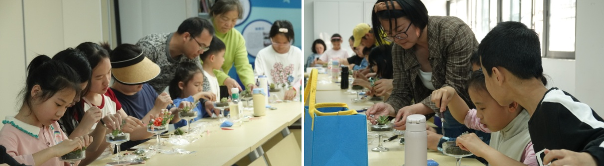手工环节围绕“微雨造境”展开,亲子家庭利用苔藓、小石子、微缩植物等材料,动手制作属于自己的春雨微观世界。孩子们专注地将迷你蘑菇插入苔藓丛中,用小石子铺出蜿蜒小路,有的还在玻璃容器中放上卡通小人,仿佛在静候一场春日细雨。朱丽亚老师不时俯身指导,帮助孩子们调整构图,让每个微缩景观都透出童趣与生机。现场家长也兴致勃勃参与其中,陪着孩子一起设计、一起动手,忙得不亦乐乎。