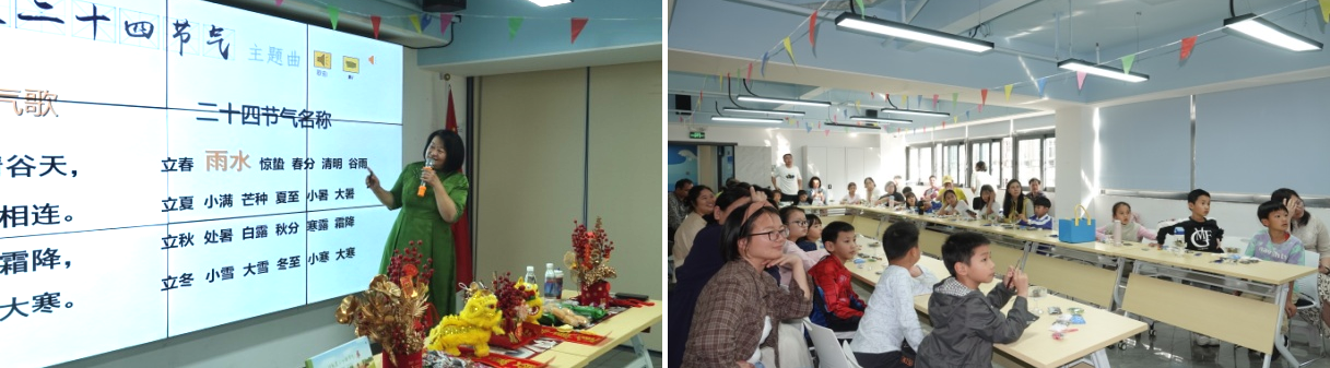 活动伊始,朱丽亚老师以“雨水”节气为切入点,为孩子们带来一堂生动的文化课。她从节气由来讲起,结合《月令七十二候集解》中“正月中,天一生水,春始属木,然生木者必水也,故立春后继之雨水”的记载,阐释了雨水“润物无声”的深意。朱丽亚老师还介绍了雨水三候——獭祭鱼、鸿雁来、草木萌动,引导孩子们观察窗外初绽的新芽,体会春天从“萌动”到“繁盛”的渐进过程。