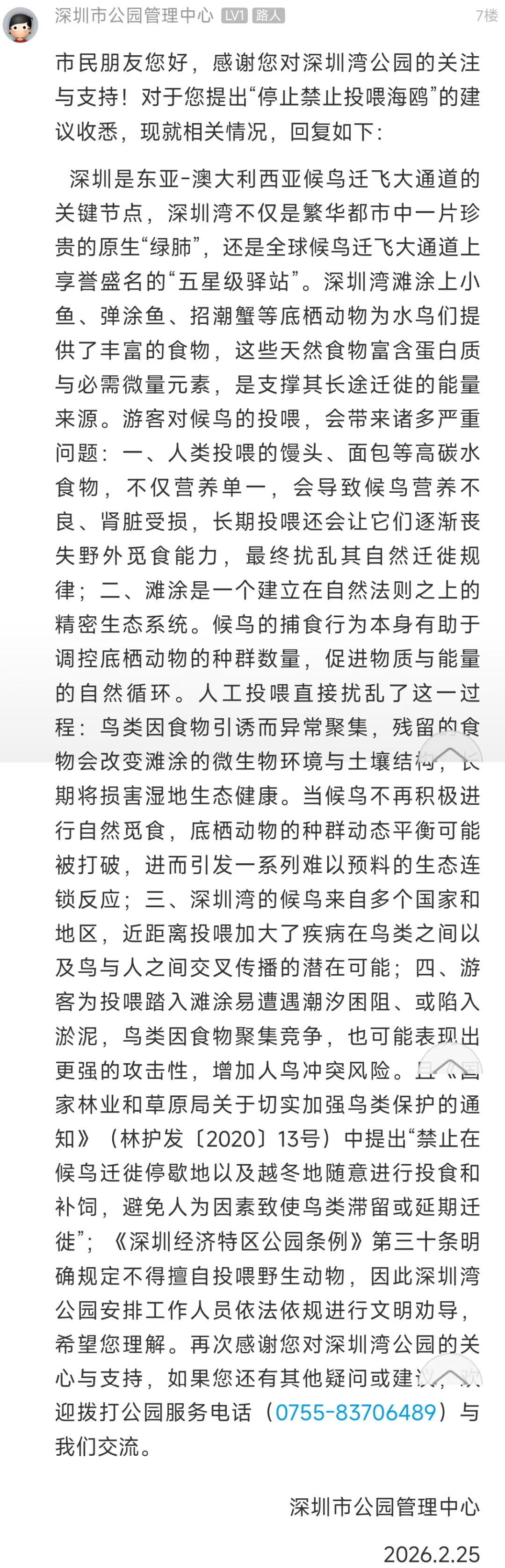 且《国家林业和草原局关于切实加强鸟类保护的通知》(林护发〔2020〕13号)中提出“禁止在候鸟迁徙停歇地以及越冬地随意进行投食和补饲,避免人为因素致使鸟类滞留或延期迁徙”;《深圳经济特区公园条例》第三十条明确规定不得擅自投喂野生动物,因此深圳湾公园安排工作人员依法依规进行文明劝导,希望您理解。