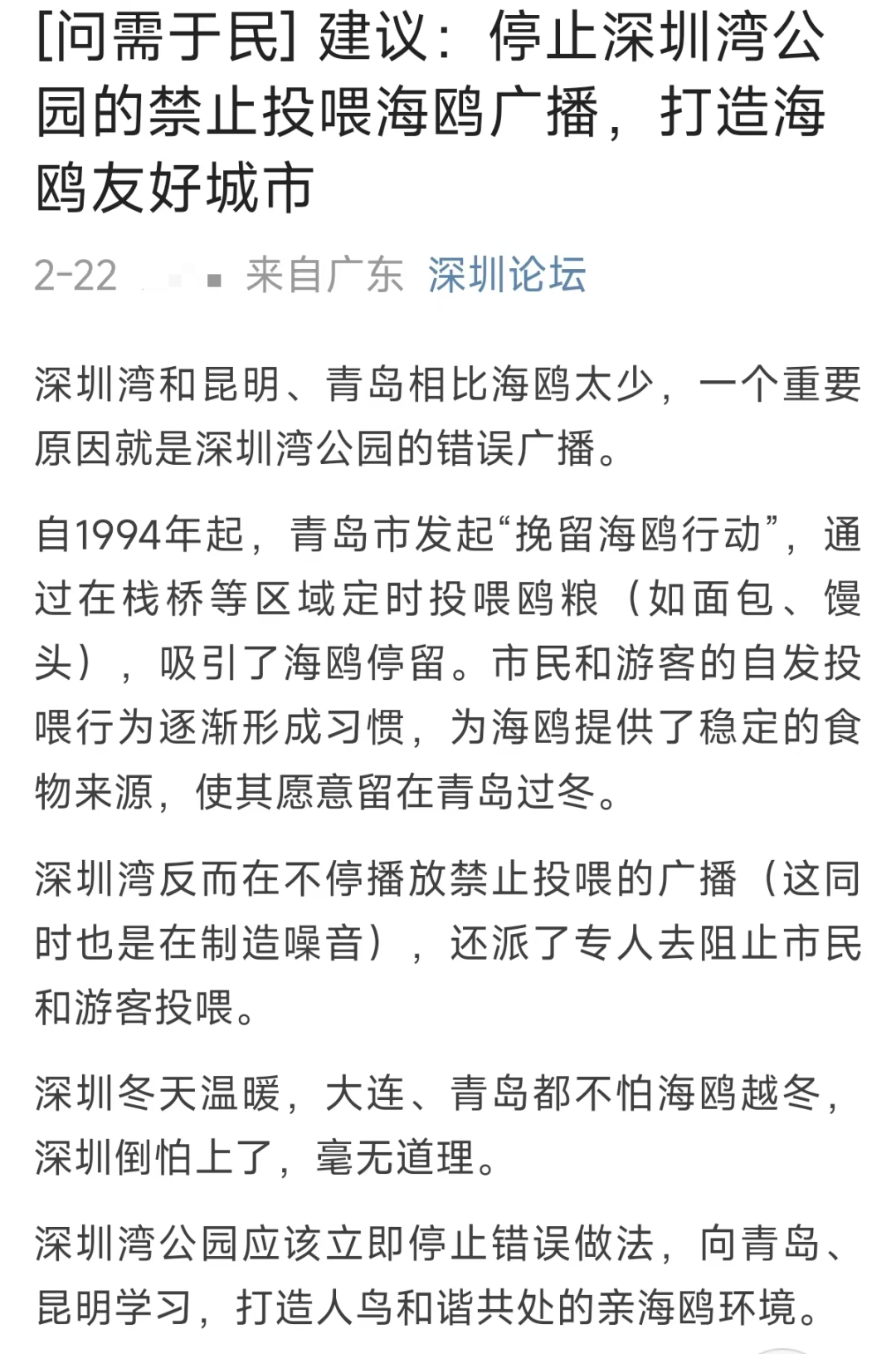 有网友在深圳论坛发帖建议