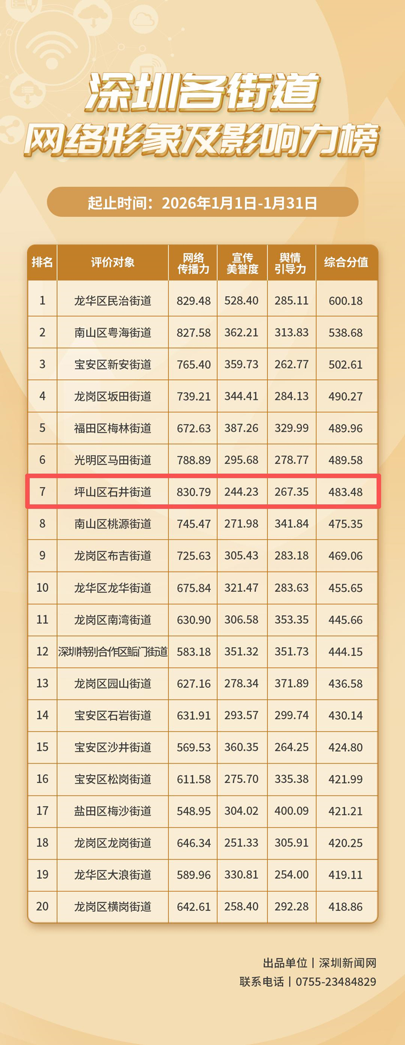 深圳新闻网2026年2月27日讯(记者 张金)近日,深圳新闻网正式发布《深圳各街道网络形象及影响力榜》(2026 年 1 月榜单),坪山区石井街道以483.48 分的综合分值跻身第七,成为坪山区唯一上榜街道。尤为亮眼的是,石井街道凭借830.79 分的高分,拿下网络传播力单项第一,展现出强劲的线上传播实力与良好的街区形象。