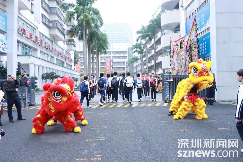 深圳市翠园文锦中学特邀醒狮喜迎师生。威武灵动的雄狮摇头摆尾,与大家热情互动,学子们摸摸狮头沾喜气,欢声笑语涤荡假期惰性,传统文化悄然浸润心田。