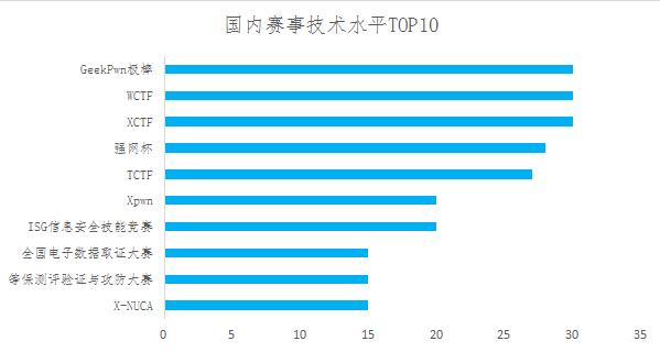 国内大赛中GeekPwn极棒大赛、XCTF、WCTF、强网杯及TCTF等在国内属于技术水平最高的赛事。GeekPwn极棒大赛吸引全球顶级黑客和顶尖网络安全战队参赛,在技术水平方面排名榜首。XCTF吸引多支全球TOP10网络安全战队参赛,推动该赛事技术水平不断提高。WCTF世界黑客大师赛吸引全球顶尖黑客参与比赛,赛事水平在国内各项赛事中处于前列。强网杯吸引了常年活跃于国际赛场的sixstars、0ops、AAA、eee、Nu1L、P4ssw0rd等多支强队积极参与,参赛技术水平也处于国内赛事第一梯队。