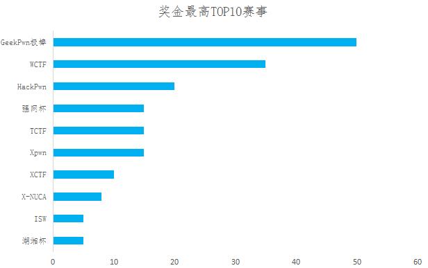 国内赛事奖励力度最大的无疑是GeekPwn极棒大赛,赛事奖金池达500万元,单项赛事奖金高达80万。WCTF自开办以来,就以打造奖金最高的CTF赛事而著称。据360Vulcan团队负责人郑文彬介绍,2017年WCTF以10万美元的奖金持续领跑全球CTF赛事。此外,HackPwn提供了高达5万美元的奖金,强网杯、TCTF、Xpwn等赛事也提供高额奖金激励。
