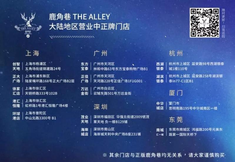 据大陆地区品牌总经理谭力说:如果你在街边小摊看到鹿角巷,那肯定是假的。因为我们只入驻大型商场。