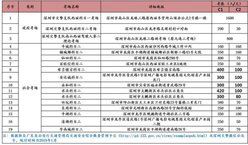 深圳市现有科目一考场1处,科目二考场9处,科目三考场6处,安全文明考场1处,考场具体情况如下: