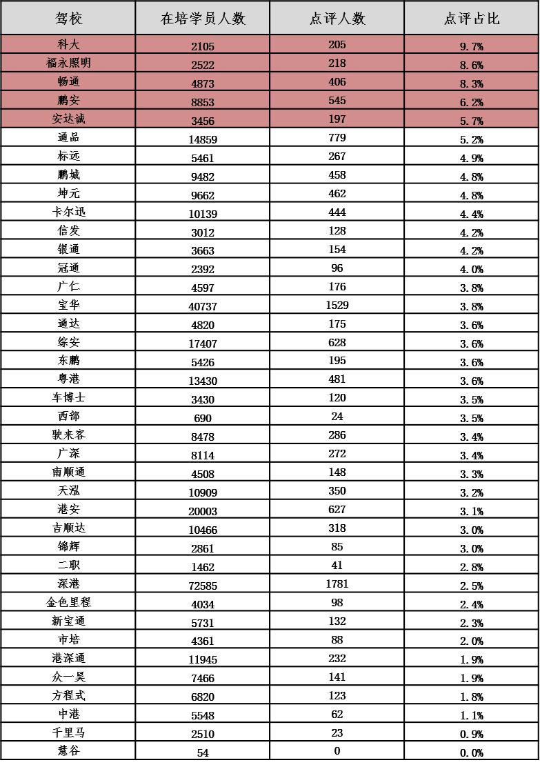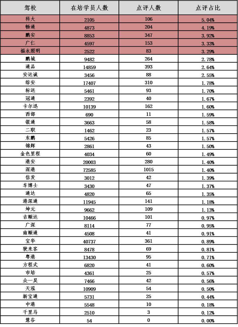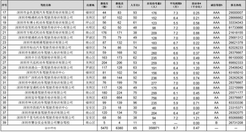 以下对深圳各驾校详细信息进行公布,市民可根据下表,选择人车比和在培待考量相对较低、学车周期较短、投诉率较低、诚信评价等级较高的驾校进行培训: