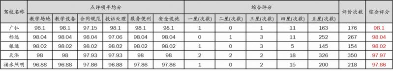学员对驾校打分平均分为95.74分(满分100分),与第三季度95.71分基本持平。其中,综合评分最高的前5名驾校分别为:广仁、标远、银通、天泓、福永照明。