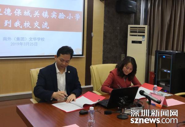 3月25日上午,广西德保城关镇实验小学领导、骨干教师在德保县教育工委书记、教育副局长李进带领下莅临南山外国语学校(集团)文华学校进行教育交流活动。南山外国语学校(集团)总校长夏育华、南外集团文华学校副校长江涛等领导热情接待,并于二楼会议室进行座谈。