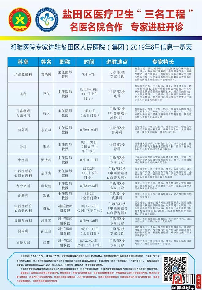 13位湘雅医院专家8月进驻盐田 市民可提前预约就诊