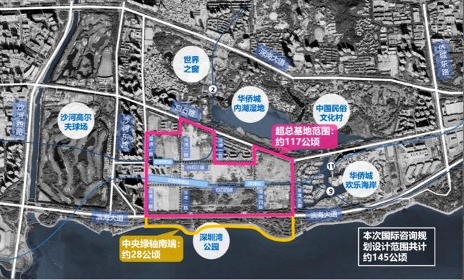 此次国际咨询的规划设计范围共计约145公顷,包括:深圳湾超级总部基地片区红线范围,即由滨海大道、深湾一路、深湾五路、白石三道、白石路所围合的区域,用地面积117公顷;片区红线范围外,深湾一路、深湾五路各自向南延伸至深圳湾公园所围合的区域,用地面积约28公顷。