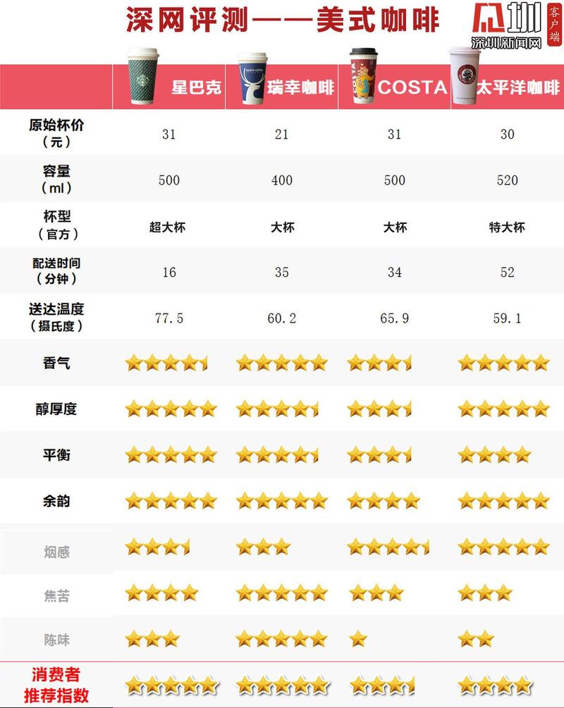 星巴克、瑞幸、太平洋星级较高,,Costa陈味较重仅获三星半
