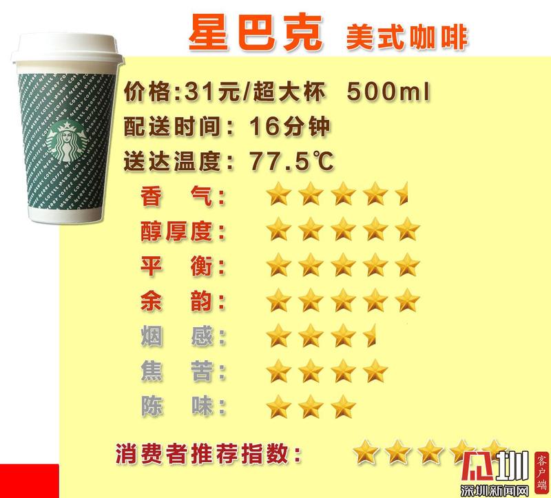 为了一探究竟,深圳新闻网测评小组联合专注产品质量、消费服务专业组织中国质量万里行,邀请了来自新闻、餐饮、IT以及其他行业的20位咖啡爱好者,对深圳市面上主流的星巴克、瑞幸、太平洋、COSTA 4个品牌,2种口味【“拿铁(热)”、“美式(热)”】的咖啡,通过主观+客观的形式进行了测评。