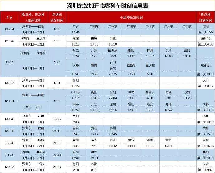 晶报君从 @深圳交通了解到,春节前,深圳站和深圳东站单天将最多加开19趟临时长途旅客列车,其中深圳站始发9趟,深圳东站始发10趟。