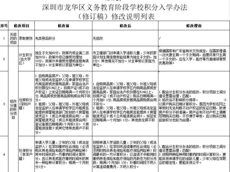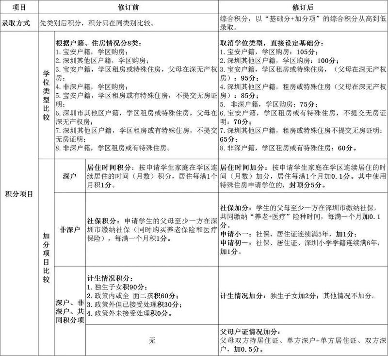 在新修订稿中,宝安区教育局结合市民意见反馈,拟将独生子女加分由1分调整至2分,并取消两项加分项,同时对部分情况分值进行调整,以体现积分梯度。