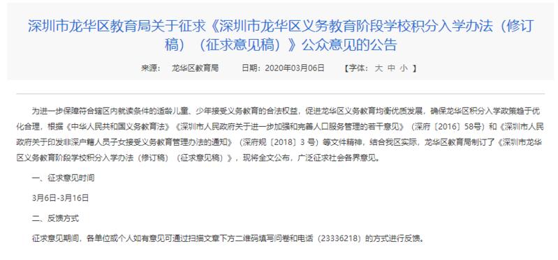 3月6日,深圳市龙华区教育局发布关于征求《深圳市龙华区义务教育阶段学校积分入学办法(修订稿)(征求意见稿)》公众意见的公告。