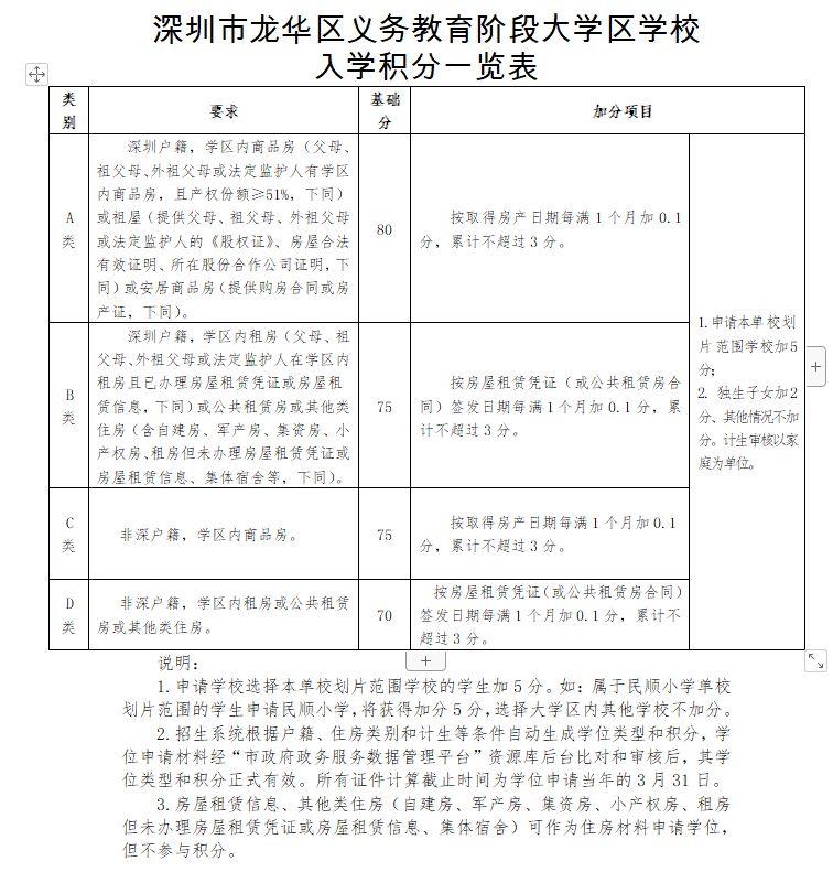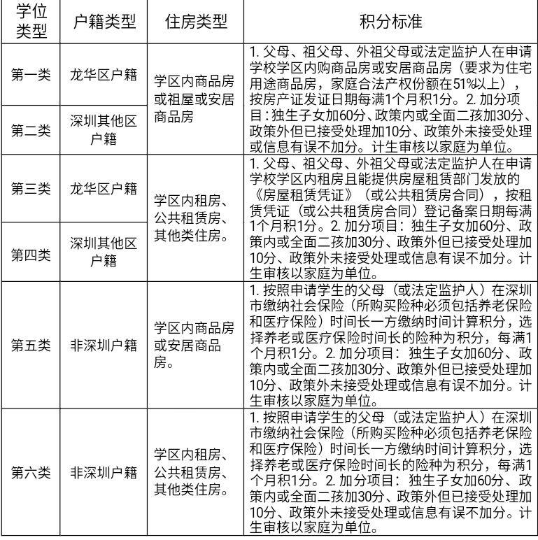 深圳户籍。申请入学适龄儿童、少年的父母(或法定监护人)户籍迁入深圳时间最长的一方计算积分,每满一个月加0.1分。