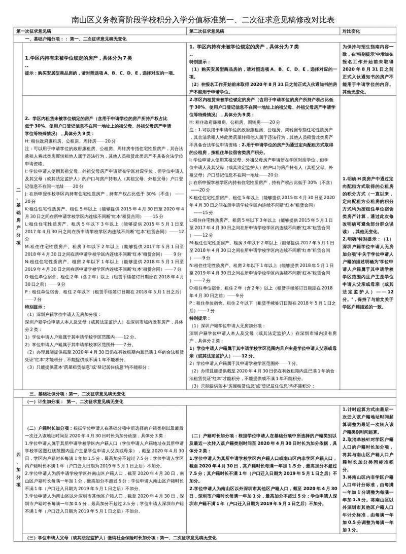 1月19日,南山区教育局第一次征求意见发出后,共收集到关于积分算法调整的反馈意见182条,并于2月10日第二次发布《南山区义务教育阶段公布学校积分入学实施办法》征求意见稿(以下简称《意见》),根据《意见》内容,拟调整2020年积分入学办法。
