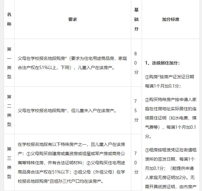 自购商品房:父母、祖父母、外祖父母或法定监护人在申请学校学区内购商品房或安居商品房,家庭合法产权份额在51%以上,按房产证(或不动产权证)购买日期每满一个月加0.1分,商品房或安居商品房购房合同不积分。