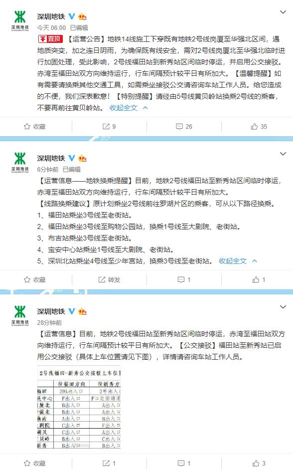 据了解,因地铁14线施工下穿既有地铁2号线岗厦至华强北区间,遇地质突变,加之连日阴雨,为确保既有线安全,需对2号线岗厦北至华强北临时进行加固处理,受此影响,2号线福田站到新秀站区间临时停运,并启用公交接驳。