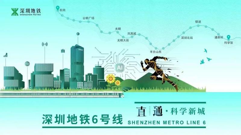 6号线海报以高科技蓝为主色调,融合光明小镇的城市田园风情,未来科技前沿产业特色,吸引世界一流科技人才,奔跑着集聚光明科学城,凝心聚力共建湾区。