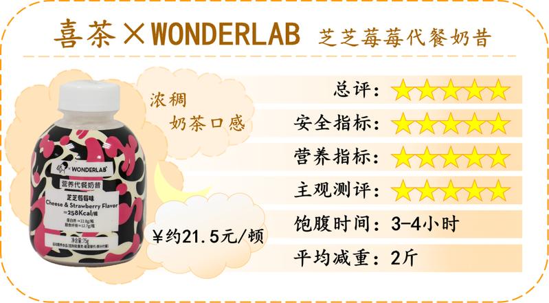 合减重效果、饱腹感、口感等多维度,测评官根据自身情况在不知道产品价格情况下,对测评产品购买意愿度进行打分。在满分为10分的情况下,其中,Fatblaster和喜茶×WONDERLAB购买意愿度得分最高,为7.3分,并列第一,其次是雀巢、汤臣倍健,获评五星。
