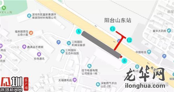 阳台山东站位于布龙路与规划佳节路交叉路口以西,沿布龙路路侧呈东西向敷设,车站为高架三层岛式车站,共设出入口4个:A出入口、B出入口、C1出入口和C2出入口。