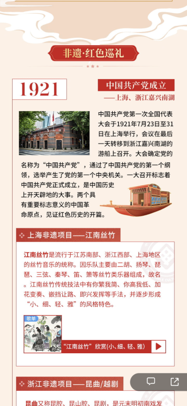 《听见非遗,红色巡礼》专题以党史百年的重大事件和地点作为线索,串联起各地方具有代表性的非物质文化遗产。以解说、影音展示等生动的方式,带领网友学习党史、领略“非遗”魅力。