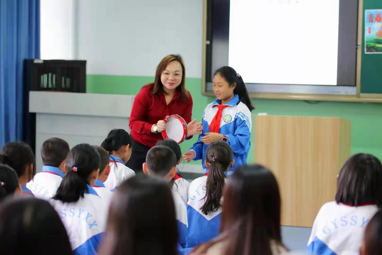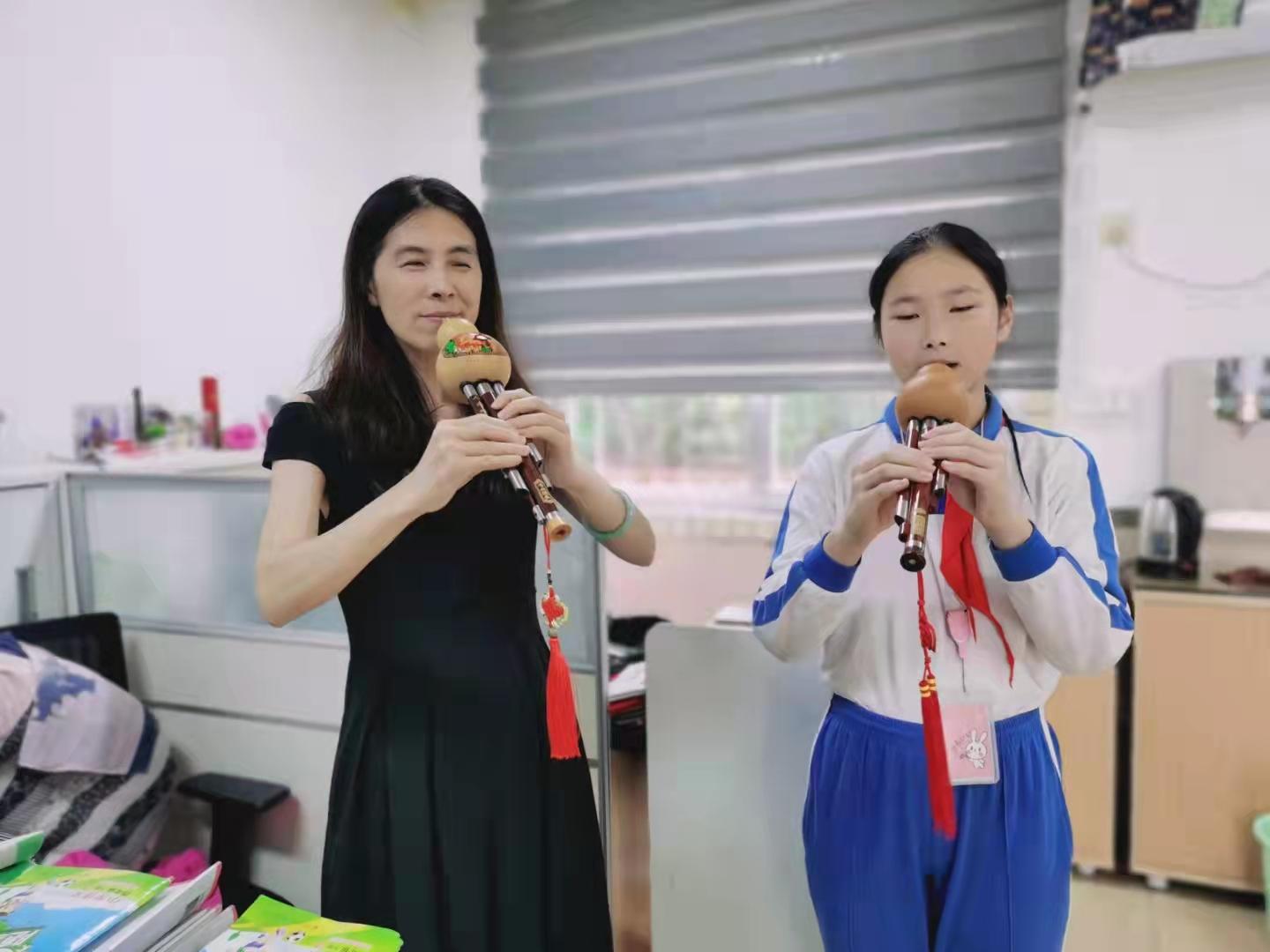▲朱清乐老师与班上学生一起吹奏葫芦丝。