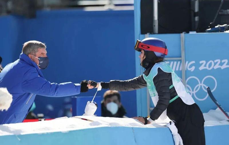 △2月8日,国际奥委会主席巴赫(左)向中国选手谷爱凌表示祝贺。